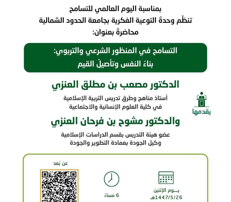 المشاركة في ندوة ( التسامح في المنظور الشرعي والتربوي ) ضمن فعاليات اليوم العالمي للتسامح من تنظيم وحدة التوعية الفكرية بجامعة الحدود الشمالية