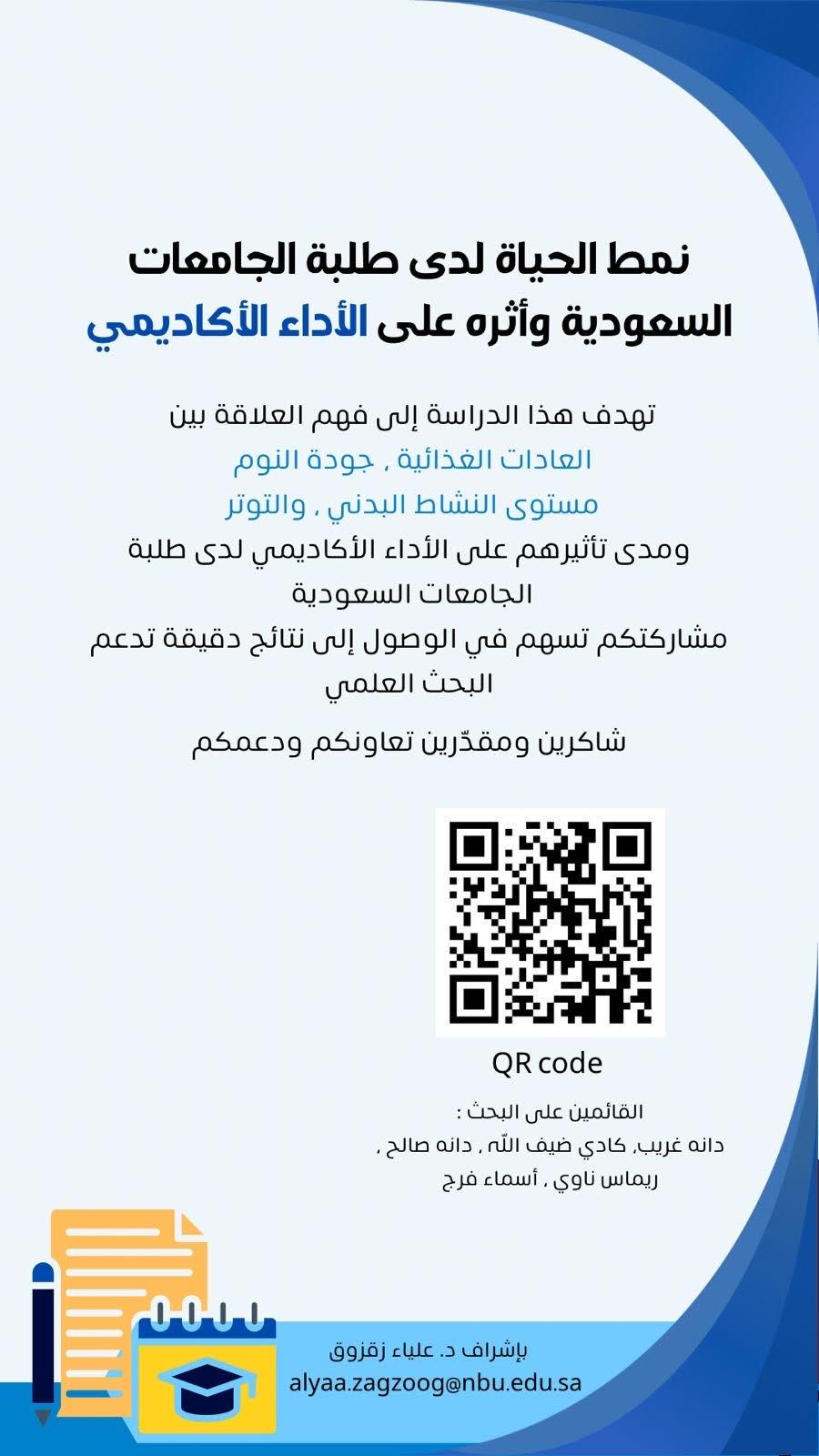 ندعوك للمشاركة في هذه الدراسة التي تهدف إلى استكشاف العلاقة بين نمط الحياة والصحة والأداء الأكاديمي لدى طلبة الجامعات السعودية