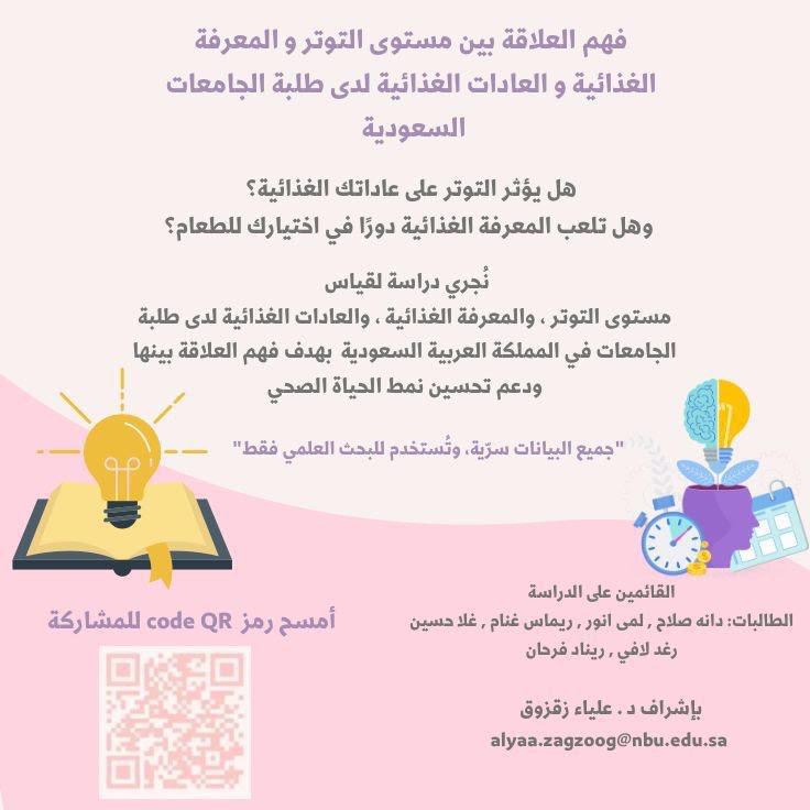 مساهمتكم تساعدنا نفهم العلاقة بين التوتر والمعرفة الغذائية والعادات الغذائية لدى طلبة الجامعات في المملكة.