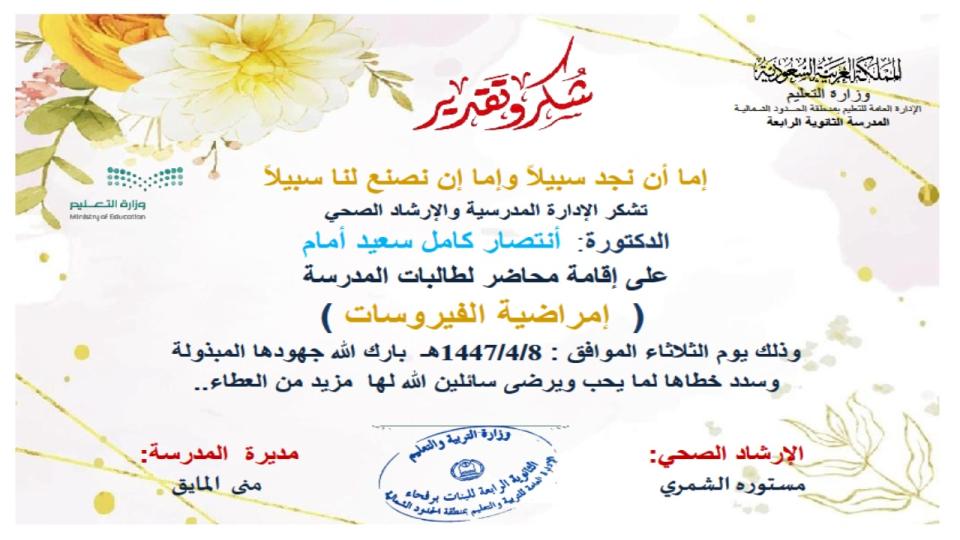 خدمة مجتمعية بمدرسة الثانوية الربعة برفحاء (محاضرة تثقيفية عن امراضية الفيروسات)