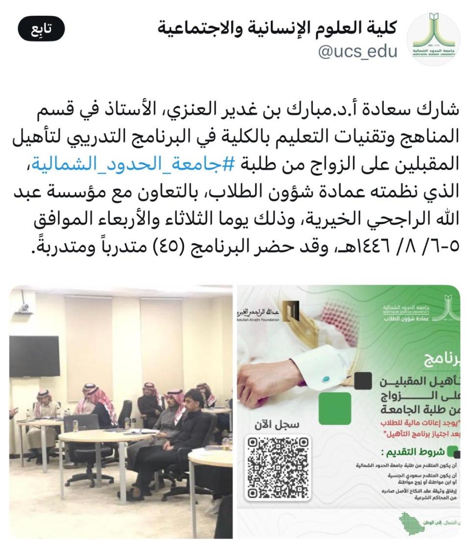 شارك سعادة أ.د.مبارك بن غدير العنزي، الأستاذ في قسم المناهج وتقنيات التعليم بالكلية في البرنامج التدريبي لتأهيل المقبلين على الزواج من طلبة جامعة الحدود الشمالية، الذي نظّمته عمادة شؤون الطلاب، بالتعاون مع مؤسسة عبد الله الراجحي الخيرية، وذلك يوما الثلاثاء والأربعاء الموافق ٥-٦/ ٨/ ١٤٤٦هـ.